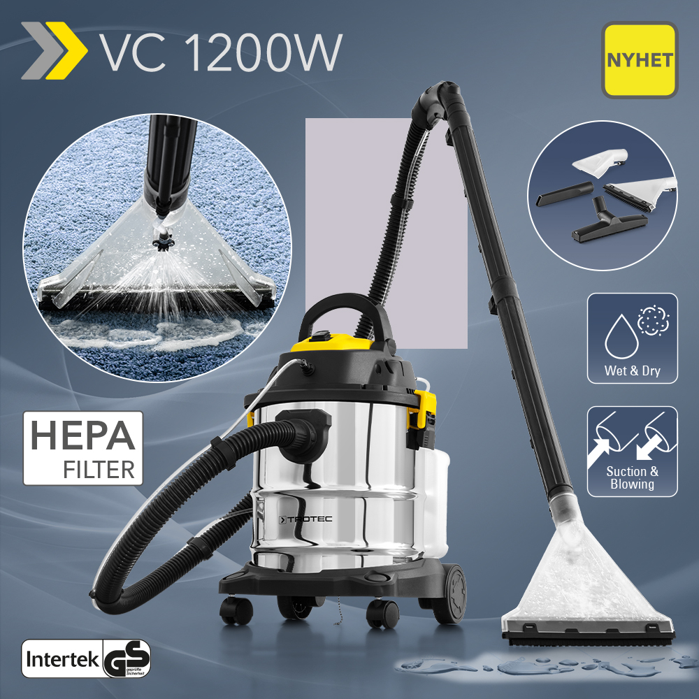 Snön faller tyst utomhus, men när den kommer inomhus förvandlas den raskt till otrevlig slask. Dåliga nyheter för parkett och laminat, och ännu sämre för mattor och stoppade möbler. Med tvätt-, våt- och torrdammsugaren VC 1200W med lövblåsarfunktion slipper du det och håller rent från grov smuts året runt. Oavsett du har behov av en torr- eller våtdammsugare, som tvättdammsugare med sprututsugning eller för praktisk smuts- eller lövblåsning tar VC 1200W itu med våt och torr grov/fin smuts på golv, men även djupt liggande smuts i hemtextilier, med hög sugkraft och enastående rengöringseffektivitet.