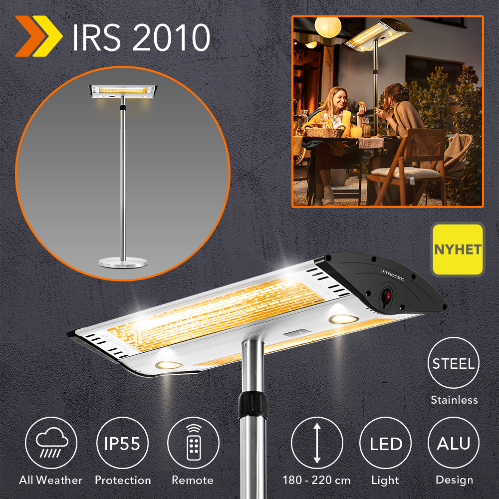 Den designade fristående värmestrålaren IRS 2010 är i en klass för sig. Den strålar skön värme på din privata terrass eller uteplats. Med omfattande utrustning, bland annat två högkvalitativa infraröd-halogenrör med tvåstegs infrarödvärme. Med imponerande komfort i form av exempelvis två LED-spotlights som fyller omgivningen med stämningsfull belysning. Och med en storslagen design, där höljet i silverfärgad aluminium med svarta accenter på ett effektivt sätt harmonierar med den tredelade teleskopstången och det solida stativet i högkvalitativt, matt rostfritt stål.