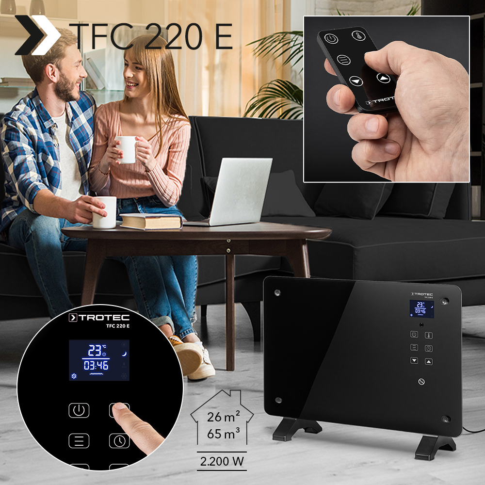 Varje grad högre värmeeffekt via det centrala värmesystemet betalar du med högre energikostnader. Alternativet: Snabbare och flexiblare än stationära värmesystem ger den termostatstyrda värmefläkten TFC 220 E som äntligen finns på lager igen en skön temperatur mellan 15 °C och 35 °C. Den snygga värmefläkten kan du ställa upp exakt där du vill ha en härligt varm temperatur. Dessutom tål den här snygga apparaten hårda tag: Den eleganta framsidan av svart säkerhetsglas är extra stöttålig och -tålig.