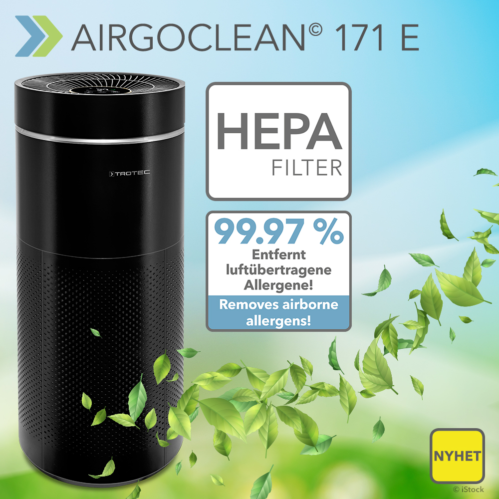 I det högeffektiva HEPA-filtret i AirgoClean® luftrengörare 171 E elimineras upp till 99,97 % av alla luftburna skadliga ämnen med en partikelstorlek på upp till 0,3 mikrometer. På så sätt stoppar denna nya effektstarka luftrengörare alla bakterien, virus, mögelsvampsporer, fina partiklar, dammkvalsterrester, pollen och allergener innan de har en chans att utsätta dig och andra där hemma för smittorisk under hösten och vintern. Detta sker helt automatiskt tack vare moderna luftkvalitetssensorer. Och med intelligent reglering – bland annat genom 360° luftrening med ”Triple Protection”-HEPA-filterteknik.