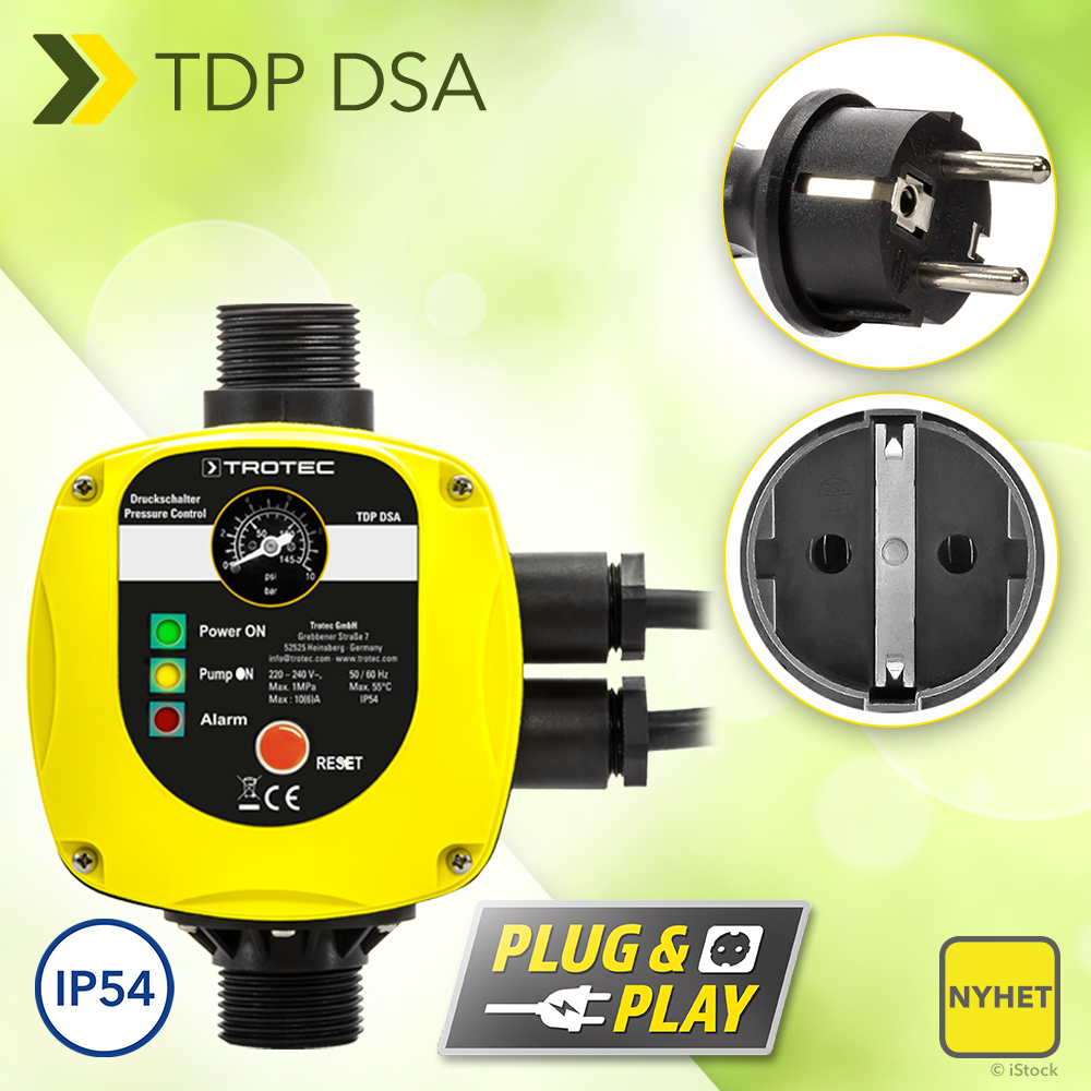 Med den elektroniska tryckomkopplaren TDP DSA från Trotec får du en bekvämare och mer tillförlitlig vattentrycksreglering – och du slipper sätta på och stänga av din pump manuellt. Denna kompakta tryckomkopplare är dessutom enkel att installera mellan pumpen och en vattenkran eller trädgårdsslang. Nu räcker det att vrida på och stänga vattenkranen eller trädgårdsslangen. Detta är perfekt till exempel för att bevattna trädgården med slang och Micro-Drip-system, för att ta upp vatten ur en brun eller ett dike eller för eventuell modifiering av pumpen i ett hemvattenverk.