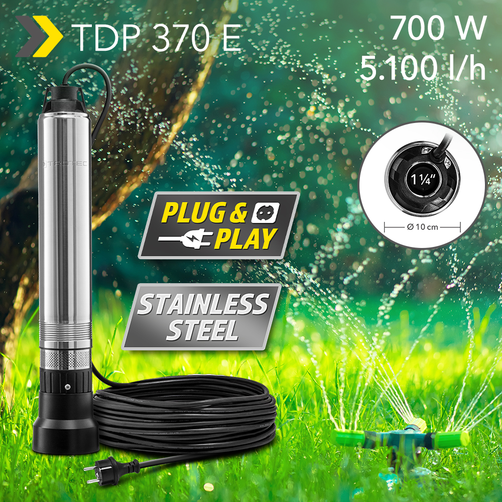 Har du egen brunn på din tomt? Lyckans ost! Eller snart kan du bli det! Det innebär nämligen att du kan använda vattnet för bevattning i trädgården eller för vissa förbrukningspunkter i huset, t.ex. för att strö över gräsmattan, vattna krukväxter eller spola toaletten. Det blir snällare för plånboken än att använda vatten från det kommunala vattenbolaget. Den rostfria djupbrunnspumpen TDP 370 E i rostfritt stål från Trotec möjliggör ett billigt sätt att ta upp bruksvatten. Inget krångel!