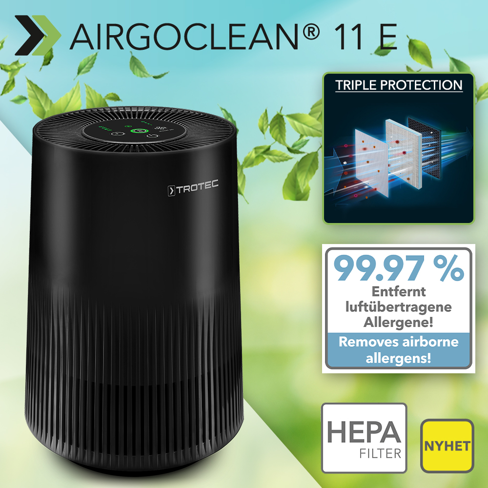 Det är inte bara coronapandemin som lär oss hur förorenad luft påverkar oss: Utöver virus belastas luftkvaliteten av bakterier, mögelsporer, kvalster, päls och hudavlagringar från husdjur och otrevlig lukt. På många platser kan det även förekomma hög belastning av fina partiklar som tar sig in genom fönster och dörrar som vi sedan andas in lungorna och som tar sig vidare ut i kroppen. Den designade luftrenaren AirgoClean® 11 E eliminerar dessa och andra skadliga föroreningar ur inomhusluften till 99,97 % med sitt högkvalitativa 3-i-1-HEPA-filter.