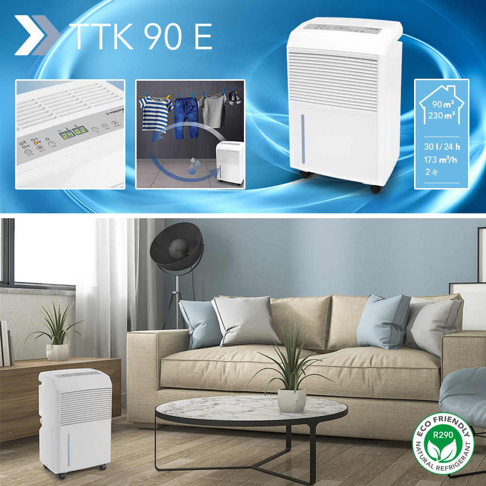 I synnerhet är det i de svalare hörnen i bostaden som fukt tenderar att samlas. Och där gör de gemensam sak med mögelsporer som alltid finns i luften. De är nämligen alltid på jakt efter lämpliga platser att slå sig ner på – för att bilda nya mögelkolonier. Avfuktaren TTK 54 E är förhindrar att dessa oönskade och ohälsosamma gäster alls kan börja spridas i ditt hem. Och det gör den mycket elegant. Mycket väl fungerande. Kort och gott: Hög prestanda till ett lågt pris!