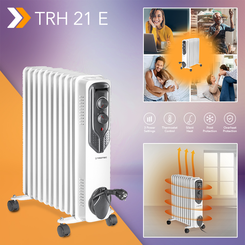 Marknaden för olja och gas ser fortsatt kärv ut prismässigt. Då är det bra att ha ett mobilt och kraftfullt alternativ i reserv, för övergångsperioden eller som extravärme under extra kalla dagar. Oljeradiatorn TRH 21 E rekommenderas särskilt för detta ändamål, eftersom den använder el och gör dig oberoende av fossila bränslen. Nu är den här. Den värmer den termiska oljan som cirkulerar i radiatorn och ger snabbt en behaglig värme– och skämmer bort dig med en varaktig värmeeffekt i upp till 30 minuter även efter att radiatorn har stängts av.