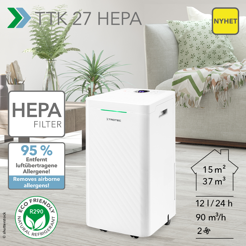 Hösten drar in den våtkalla fukten inomhus och gör att vi lätt blir förkylda. Det finns fortfarande en sak du kan göra för att sätta stopp för detta. Den multifunktionella designade luftavfuktaren och -renaren TTK 27 HEPA med sin kombination av två teknologier: denna nyhet avfuktar inomhusluften med upp till 12 liter dagligen och befriar den från upp till 95 % av alla sjukdomsalstrande bakterier och virus, mögelsporer, pollen, husdamm, fina partiklar, allergener och andra skadliga partiklar tack vare det integrerade HEPA-filtret.