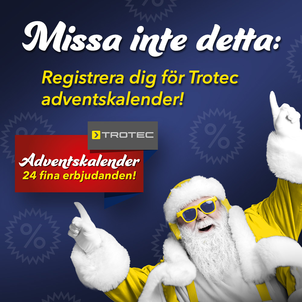 Var med och spara! Trotecs adventskalender börjar den 01.12.2022. 24 fantastiska erbjudanden väntar på dig fram till 24.12.2022. Registrera dig helt enkelt för nyhetsbrevet så får du varje dag en överraskande produkt från vårt sortiment till ett specialpris. Det är värt det! Även efter det kommer du alltid att få information om de senaste erbjudandena med Trotecs nyhetsbrev och kan dra nytta av superbesparande priser. Registrera dig direkt här: se.trotec.com/shop/trotec-newsletter