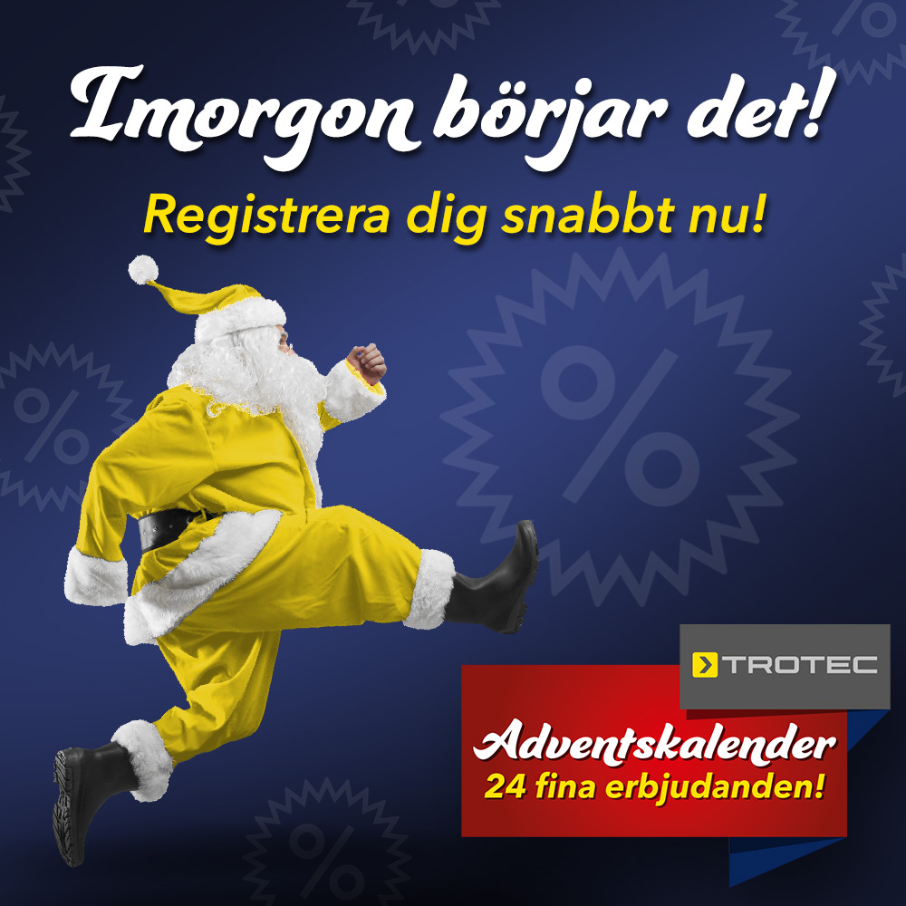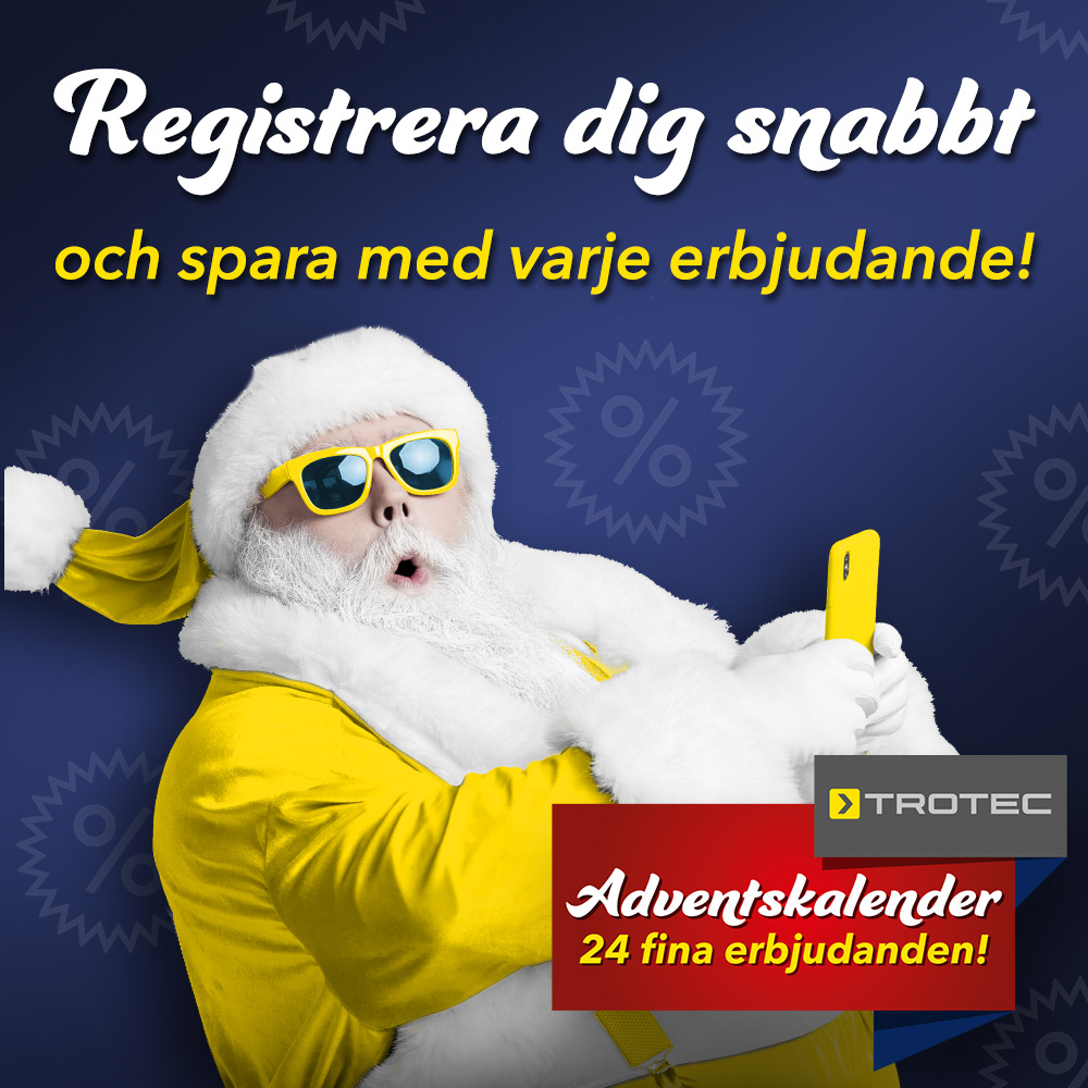 Från och med den 01.12. kommer det första erbjudandet till din e-postlåda! Allt du behöver göra är att registrera dig för Trotecs adventskalender. Fram till den 24.12. får du totalt 24 attraktiva erbjudanden från olika produktkategorier. Vare sig det handlar om elvärmare, elverktyg eller mätutrustning – här finns något för alla. Du kommer säkert att hitta en eller annan praktisk presentidé! Även efteråt får du alltid information om aktuella erbjudanden med Trotec-nyhetsbrevet och kan dra nytta av de riktigt tuffa rabatterade priserna. Anmäl dig direkt här: de.trotec.com/shop/trotec-newsletter: se.trotec.com/shop/trotec-newsletter