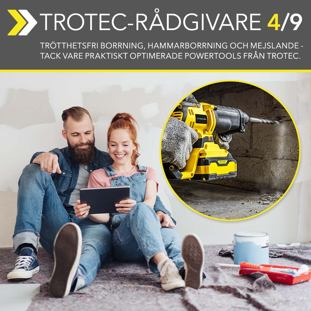 En borrhammare och en slagborrmaskin – med dessa verktyg behöver du inte dra dig för att utföra något renoveringsarbete. Framför allt inte med tanke på att båda verktygen är beprövade PowerTools från Trotec. Med den kraftfulla batteridrivna borrhammaren PRDS 10-20V möter du utmaningen med stålhårda väggar, som det här kraftpaketet borrar sig igenom utan ansträngning tack vare den pneumatiska hammarmekanismen. Och med den kompakta slagborrmaskinen PHDS 10‑230V utför du flexibelt arbeten snabbt och lätt med slagborr, borr- och skruvdragare i trä, betong eller stål. En oslagbar duo – till ett oslagbart pris.