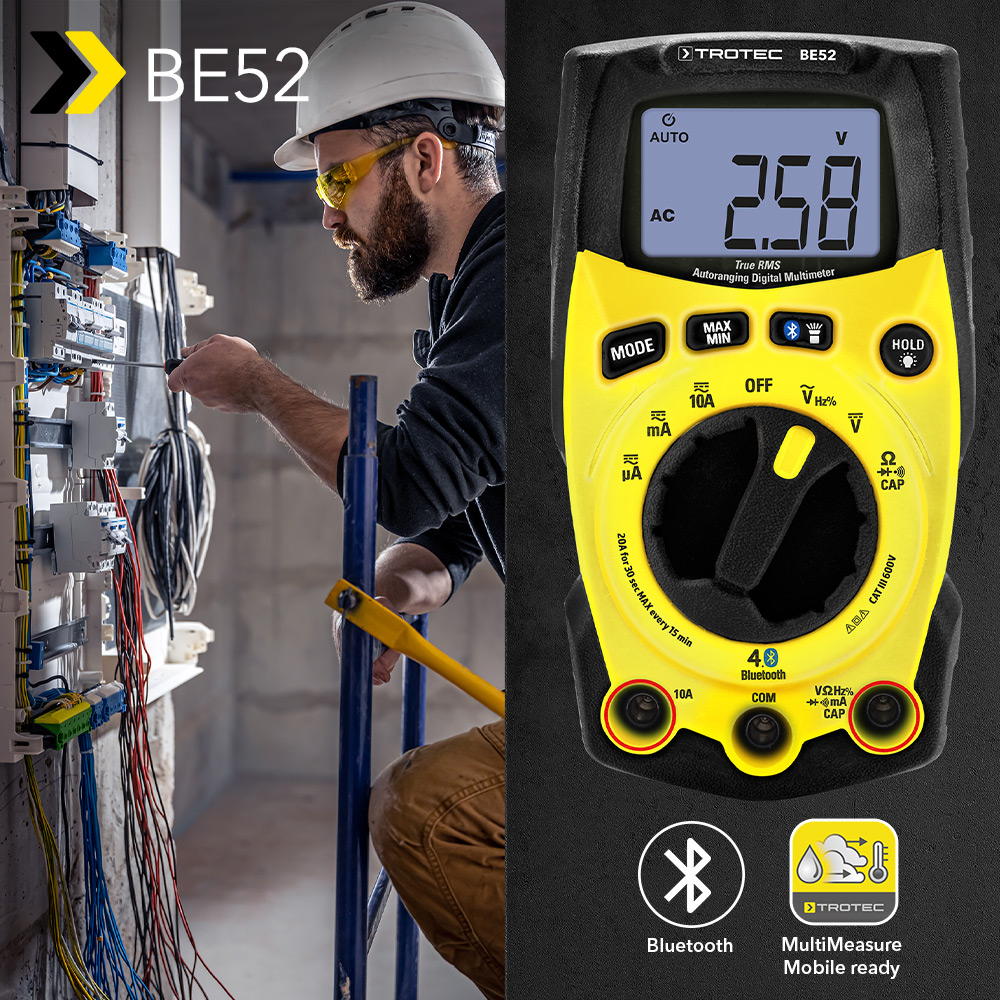 Tuff miljö? Hög spänning? Det är ingen match för nya BE52 True-RMS-multimetern. Den särskilt slitstarka mätanordningen för de tuffaste arbetsförhållandena och med tio olika funktioner har den många arnvändningsområden inom hantverk och hobby, verkstad och fordon och är även en stor tillgång för hemmafixaren. Du kan använda en för mätning av lik- och växelspänning, lik- och växelström, kapacitansmätningar, frekvens- och arbetscykelmätningar, motståndsmätningar, diodtester eller akustiska kontinuitetstester. Och via Bluetooth® överför du mätdata till din smartphone – för professionell utvärdering med gratisappen MultiMeasure Mobile från Trotec.
