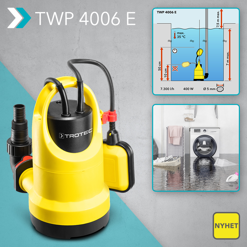 Även om mottot ”slå av på takten” kan vara bra finns det vissa rutinjobb som gärna kan få gå lite snabbare. Det kan gälla upp- och utpumpning av vatten ur utomhuspooler, jacuzzibad, trädgårdsbrunnar, regnfat, cisterner och regnvattenuppsamlare. Det kan också gälla snabb torrläggning efter tvättmaskinsläckage, hällregn som orsakar översvämning eller grundvatten som kommit upp i källare och bostadsutrymmen. Med den 750 watt starka dränkbara pumpen TWP 7506 E går det undan när det gäller större vattenmängder så länge de inte innehåller större partiklar.