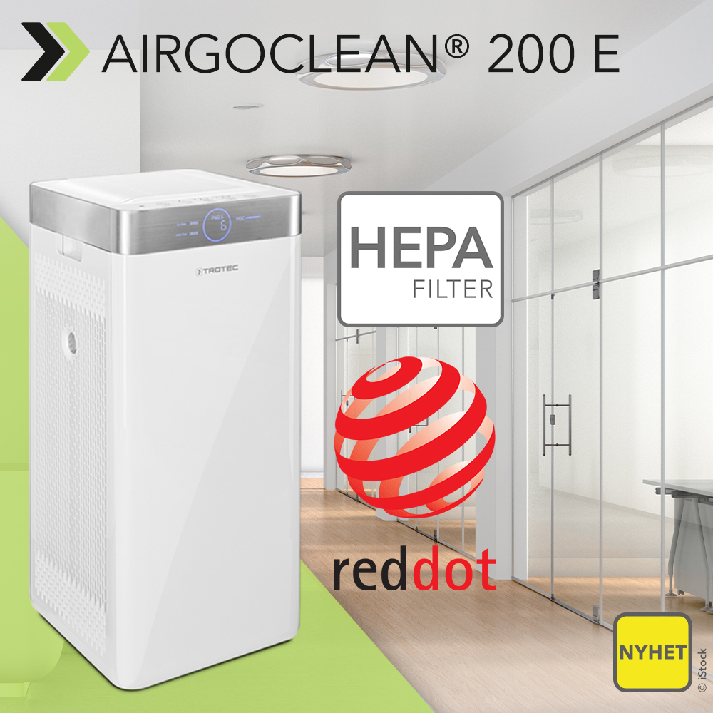 Den nya luftrengöraren AirgoClean® 200 E gör stor skillnad – och det med stil – mot alla typer av luftföroreningar: Med sitt polarvita, borstade hölje i rostfritt stål sätter den nya visuella standarder och har till och med vunnit designpriset Red Dot Design Award. Dessutom är denna apparat utrustad med utomordentligt effektstark HEPA-filterteknik som håller rumsluften till 99,97 % fri från sjukdomsalstrande ämnen så som allergener, bakterier, virus, fina partiklar, mögelsporer, pollen, kvalster och pälshår samt otrevlig lukt.