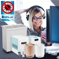 Skivluftfuktaren för större utrymmen förenar hög avdunstning med ekonomisk kontinuerlig drift. Den hygrostatstyrda luftfuktighetsregleringen kompletteras med en roterande avdunstningsfilterduk som dessutom renar luften. Andra fördelar med detta aggregat är den låga bullernivån och låga förbrukningen.