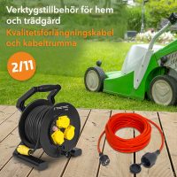 Fördelarna med vår praktiska förlängningskabel 230 V, 16 A visar sig exempelvis i arbetssituationer som dessa: När du ska använda motorsåg för att såga i träd längst ner i trädgården. När du måste borra längst på en våning utan egna eluttag. Detta proffiga tillbehör gör det mögligt att förlänga räckvidden för dina kabelanslutna elektriska tillbehör mer 15 respektive 25 meter för bättringsarbeten i trädgården eller inomhus – för enklare användning av elektriska verktyg, hushålls- och köksapparater, musik- och belysningssystem och kontorsmaskiner. Med denna flexibla förlängningskabel använder du det eluttag du har tillgång till.