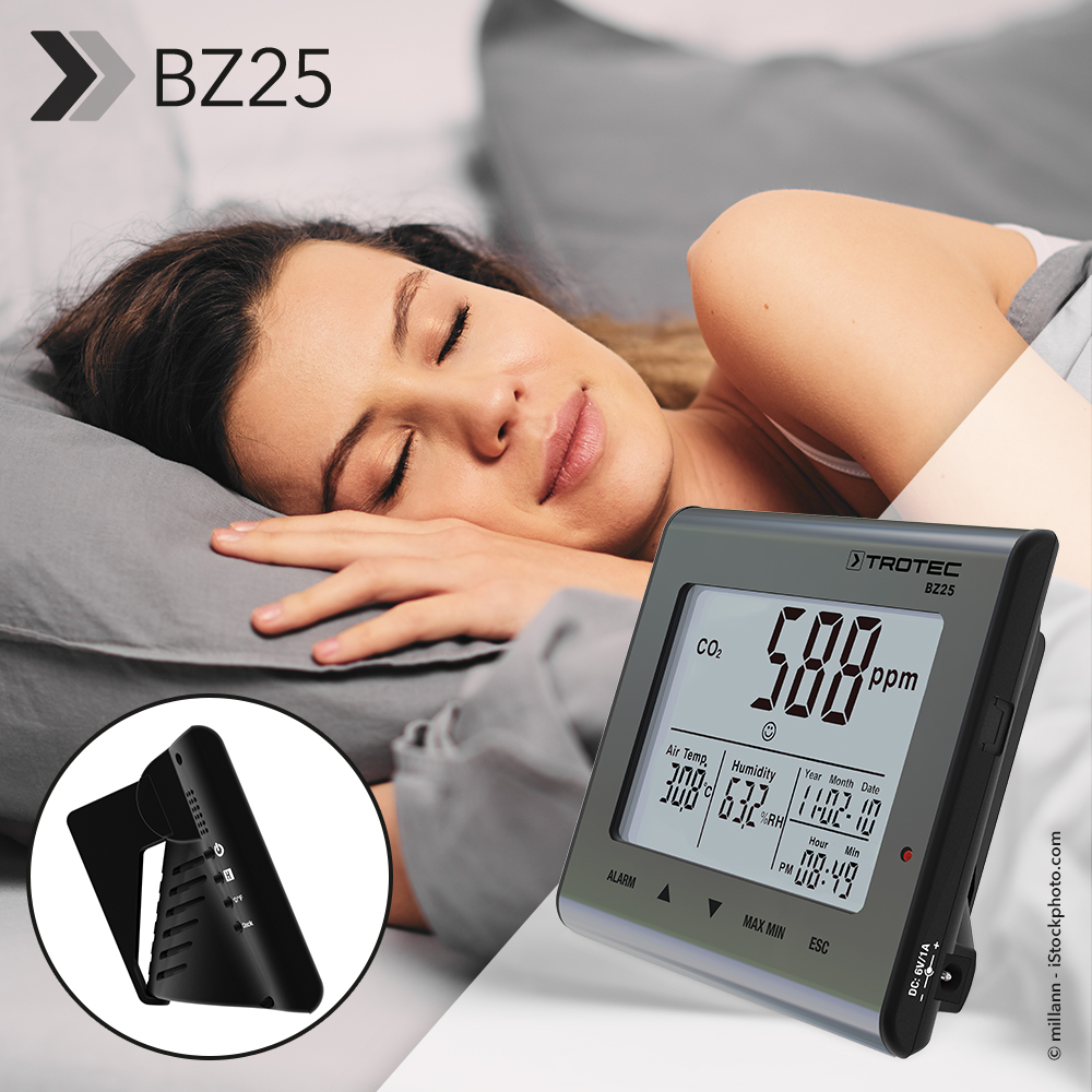 ”Jag har legat vaken hela natten!” Känner du någon som av och till återkommer till detta tema? Kanske till och med du själv? Det finns väl knappast något som sätter så mycket käppar i hjulet för vår kroppsliga och mentala prestationsförmåga som sömnbrist. Den huvudsakliga orsaken går att härleda till för höga koldioxidhalter (CO2) i sovrummet. Av den här anledningen rekommenderar sakkunniga inte bara att man håller ett fönster öppet utan att man även använder sig av en övervakningsanordning så att man håller koll på inomhusluftskvaliteten – exempelvis luftkvalitetsmonitorn BZ25.
