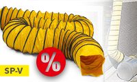 Vi rear nu ut de extremt lätta och böjliga standard-fläkt-spiralslangarna SP-V! Sammanlagt kan du välja mellan inte mindre än 9 olika storlekar – med en diameter på från 155 mm upp till 605 mm. Slangarna passar utmärkt till uppvärmning och ventilation och kan böjas i förhållandet 1:10. Den PVC-belagda polyamidväven är robust och har stärkts med stålspiraler så att slangarna inte går sönder. SP-V-slangarna används med fördel till ventilation och avluftning i luftkonditionerings- och ventilationsbranschen, vid uppförande av mässor, i samband med olika event eller torkning av byggnader.