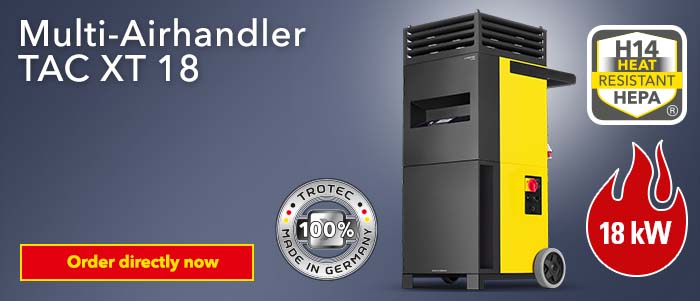 Tämän siirrettävillä suurtehoilmanpuhdistimilla ainutlaatuisen monitoiminnallisuuden ansiosta huipputehokkaat ilmanpuhdistimet TAC XT 18 (18 kW:n lämmitysteho) soveltuvat erityisesti monialaiseen käyttöön nykyisessä pakolaistilanteessa. Multi-Airhandler TAC XT -ilmankäsittelylaite on saatavana Trotecin verkkokaupasta sekä Trotecin Heinsbergin myymälästä.