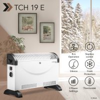 Konvektorin TCH 19 E integroitu termostaatti varmistaa tasaisen lämpimän ilmavirran ja säätää huoneen lämpötila automaattisesti. Energiatehokkuus säästää selvää rahaa! Lämpötehoa riittää 2000 wattiin asti, joten kylmätkin huoneet muuttuvat nopeasti mukavan lämpimiksi. Konvektorilämmityksen periaatteen lyhyt esittely: mikä se oikeastaan on? Konvektorin, esimerkiksi TCH 19 E, sähkölämmitteiset langat lämmittävät ilman, joka nousee lämpimänä ylöspäin. Lämmennyt ilma nousee ylöspäin, jolloin luonnollinen imu vetää lisää kylmää huoneilmaa laitteeseen. Lämmin ilma kiertää koko huoneessa jatkuvasti ja virtaa joka kulmaan.