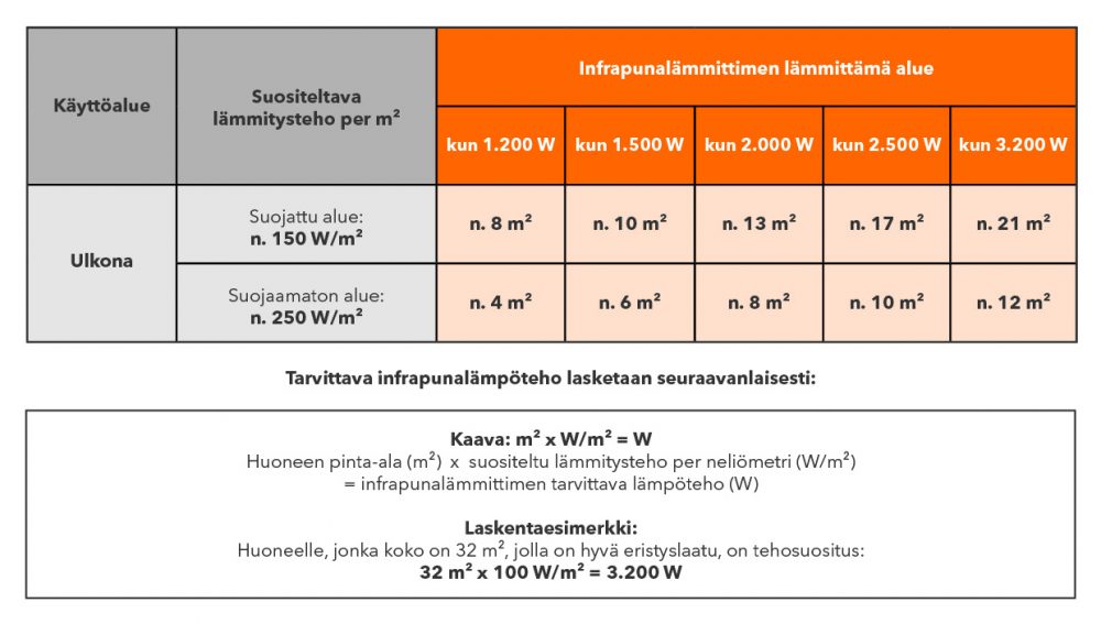 terassin pinta-ala (m²) x suositeltu lämpöteho per neliömetri (W/m²) = infrapunalämmittimen tarvittava lämpöteho (W)