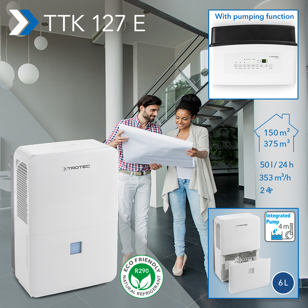 Asiakkaidemme suosittelut kuumentavat ilmankuivaimen TTK 127 E kysyvään vielä lisää. Se nimittäin vakuuttaa tehokkuudellaan: Laite säätää ilman kosteuden lämpötilan perusteella automaattisesti mukavaksi, poistaa ympäristön ilmasta jo 50 litraa kosteutta päivää ja soveltuu 150 m² kokoisiin tiloihin asti. Ja mikä parasta: Vesi voidaan paitsi tyhjentää automaattisesti, myös pumpata laitteen laadukkaalla kondensaattipumpulla esimerkiksi lähimpään viemäriin enintään 4 metrin korkeuteen. Tehokas paketti on heti jälleen saatavana. VIELÄ jälleen saatavana!