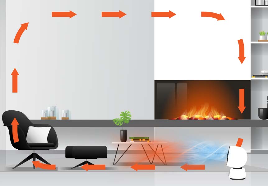 Kamiinan tai uunin tuottaman lämmön jakaminen suureen asuinympäristöön on toinen asia. Lämmön leviäminen huoneeseen, viereisiin huoneisiin tai useaan kerrokseen vaatii aikaa. Lämmin ilma nousee ensin ylös kattoon ja leviää sitten konvektion vaikutuksesta ympäristöön.