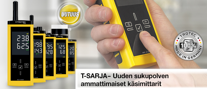 Uudet ammattilaiskäsimittarit on valmistettu Saksassa korkean laatuvaatimuksen normeissa. Ne kestävät niin kylmyyttä (-20 °C asti) kuin kuumuuttakin (50 °C asti). Näiden viiden uuden mittarien kanssa voit suorittaa rakennustarkastuksia tai määrittää tarkan puun tai materiaalin kosteuden. T-sarja kattaa suhteellisen ilmankosteuden, ilman lämpötilan, kastepisteen, absoluuttisen kosteuden, seossuhteen, pintalämpötilan ja materiaalikosteuden.