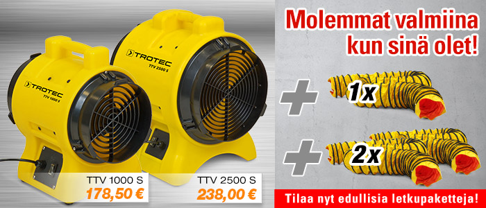 Jälleen meillä: aksiaalipuhaltimet TTV 1000 S ja TTV 2500 S ovat nyt jälleen saatavissa. Molemmat soveltuvat erityisen hyvin työtiloihin, joissa tarvitaan paljon raikasta ilmaa, kuten viemäri- ja hitsaustöissä. Saat molemmat syöttöpuhaltimet nyt yhdessä huippuedullisten letkupakettien kanssa. Molemmat ovat valmiina – kun sinä olet!