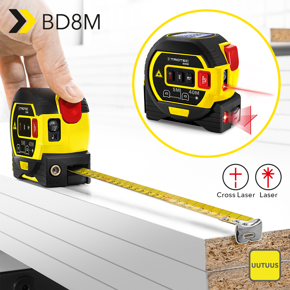 UUTTA Laseretäisyysmittari BD8M: laseretäisyysmittari, ristiviivalaser ja ulosvedettävä 5 metrin mittanauha samassa laitteessa – vihdoin saatavana