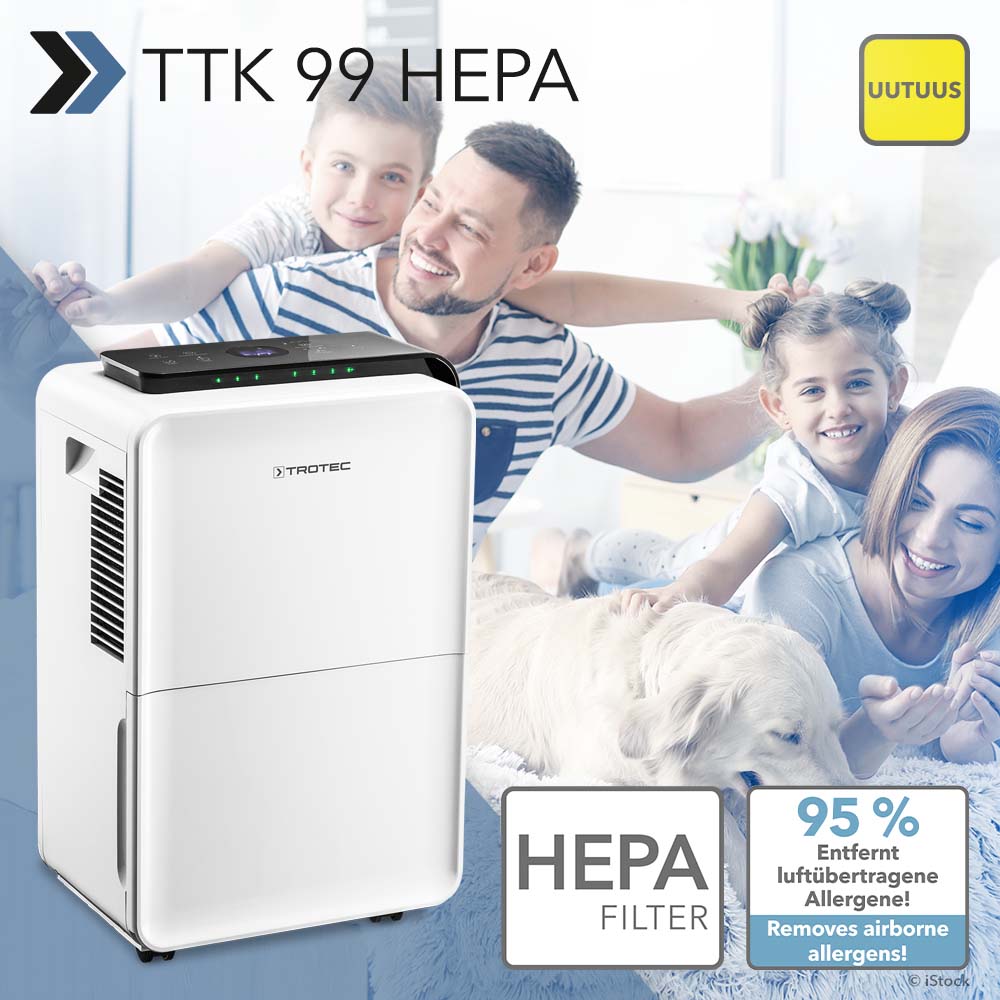 Kaksi ajankohtaista kysymystä: Miten poistan kostean syysilman asuin- ja toimistotiloista ennen terveydelle haitallista hometta alkaa muodostua? Ja miten voin korona- ja influenssa-aaltojen lähestyessä pitää tiloissani taudinaiheuttajat, esimerkiksi virukset ja bakteerit sekä muuta haitalliset aerosolit poissa läheltäni? Ratkaisu on uusi TTK 99 HEPA: Se on luokkansa tehokkain – ja siinä on kaksi sisäilmaa tehokkaimmin parantavaa teknologiaa: hygrostaatin ohjaama automaattinen kosteuden pois ja ilman puhdistus HEPA-suodattimella.