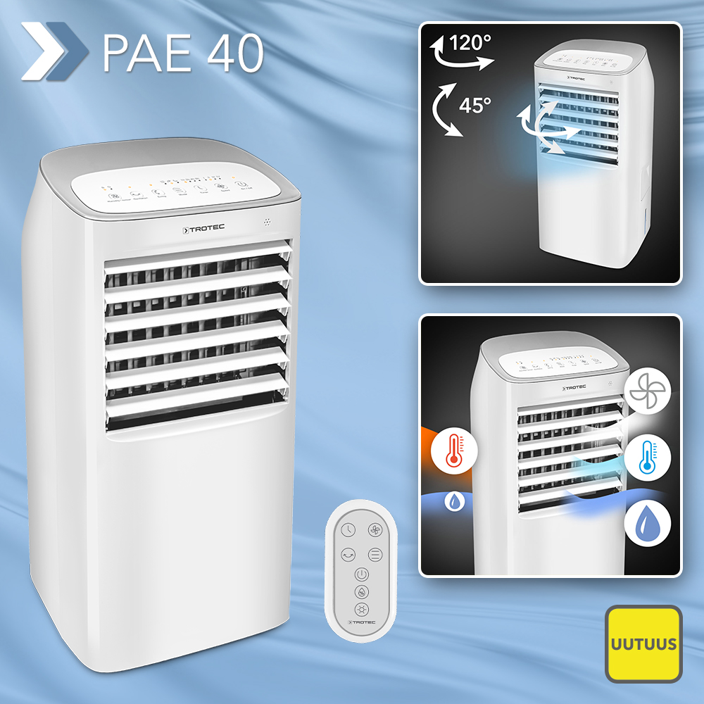 Iäkkäämmät keskuudessamme muistavat vielä aikaisemmat kesät. Joskus ne olivat niin viileitä ja sateisia, että tuntui siltä, kuin olisi siirtynyt ailahtelevasta huhtikuusta suoraan syksyyn. Mutta ne ajat ovat ohi. Seuraava kuuma kesä on taas tulossa, loputtomine helleaaltoineen yhdistettynä painostavaan ja tunkkaiseen ilmaan kotona ja toimistossa. Jos et halua uiskennella omassa hiessäsi, tarvitset ammattimaisen strategian kuumuuden välttämiseksi. Ja sellaisen tarjoaa uusi 4-in-1-haihdutusilmanjäähdytin PAE 40: Nopea jäähdytys ja raikkaus luonnollisesti kostutetulla ja puhtaalla huoneilmalla – ja mukavasti kaukosäätimellä, mutta ilman kemiallisia kylmäaineita ja häiritsevää poistoilmaletkua!