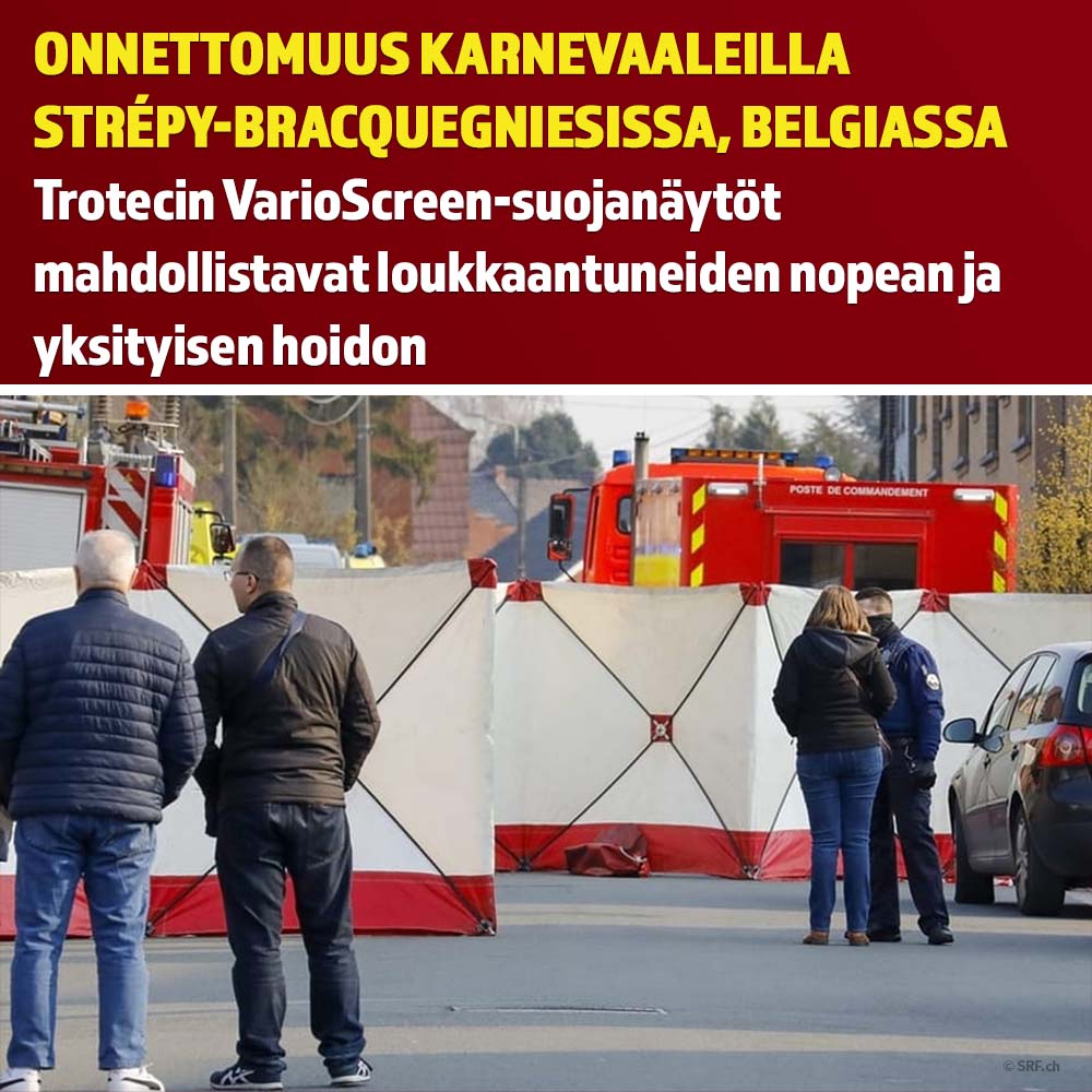 Onnettomuus karnevaaleissa Strépy-Bracquegniesin kylässä Belgiassa Trotecin VarioScreen-näkösuojaseinät mahdollistavat loukkaantuneiden nopean hoidon ja näkösuojan Lähetetty 30. maaliskuu 2022 henkilöltä Sofia Andersson Suurissa operaatioissa, kuten Strépy-Bracquegniesin onnettomuudessa Belgiassa, jossa auto syöksyi väkijoukkoon karnevaalitapahtumassa sunnuntaina, jokainen sekunti on tärkeä, loukkaantuneiden ensihoidossa. Lue loppuun Kategoriat: Ajankohtaista, TROTEC | Avainsanat: Belgia, Heinsberg, Trotec, VarioScreen, karnevaali, loukkaantuneet, näyttöseinät, sairaanhoito, suuroperaatio | Kirjoita kommentti
