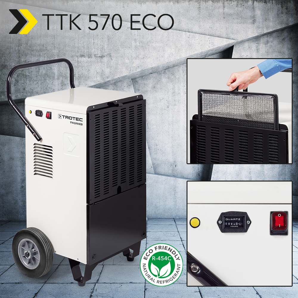 Erityisen kestävä ulkokuori vankan teräsrakenteen ansiosta. Sisällä tehokas rotaatiokompressori takaa erinomaisen ilmankuivaustehon – 127 litraa vettä päivässä. Siinä on vihdoinkin jälleen saatavana olevan hinta-laatumestarimme TTK 570 ECO:n lyhyt esittely – erityisen taloudellinen ratkaisu kaupallisen sektorin kosteudenpoistotehtäviin. Koska yrityskäyttöön tarkoitetulla ilmankuivaimella on paljon muutakin tarjottavaa, on aika vilkaista vielä kerran sen ammattimaisen kuoren alle. …