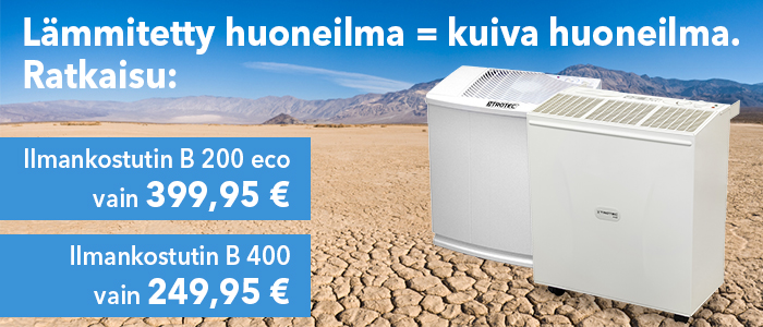 Päivät lyhenevät, ilma viilenee. Lämmitys on laitettava päälle, jotta huoneissa olisi mukavan lämmin. Valitettavasti tämä kuiva lämmitysilma saattaa vahingoittaa sisätiloja – varsinkin jos kyse on kalliista kirjoista ja taideteoksista, voi vahinko olla suurikin! Myös flunssavirukset viihtyvät erityisen hyvin lämmitetyissä ja kuivissa tiloissa, ja pöly pysyy ilmassa pitempään. Hyvä uutinen on, että näistä terveytesi ja kotisi haittatekijöistä pääset helposti ja vaivattomasti eroon: napin painalluksella! Trotecin siirrettävistä ilmankostuttimista B 200 eco ja B 400 saat nyt huippualennukset. Lue loppuun