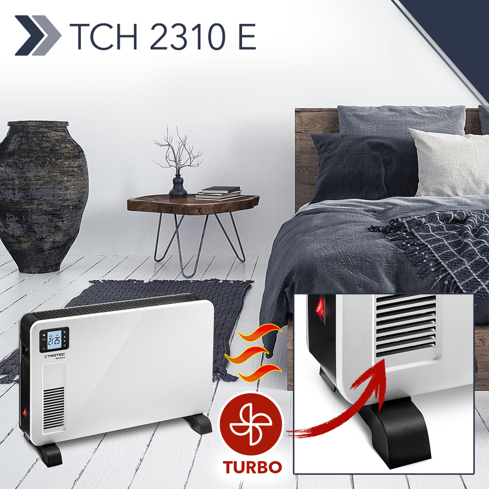 Nyt hyödyt jokaisesta käyttämästä jäävästä kilowattitunnista. Syksy tulee kuitenkin ja sen myötä selvästi kylmemmät päivät. Siksi Trotec auttaa säästämään, ja taas saatava design-konvektori TCH 2311 E pitää kylmän poissa ainakin omasta kodistasi.Todella edullista lämpöä – hankintahinta on ilahduttava edullinen ja sähköä kuluu vähemmän, sillä portaaton termostaatti auttaa pitämään kustannukset kurissa. Kaikki helposti ohjattavissa kaukosäätimellä: kolme tehoa 2 300 wattiin asti tottelevat käskyjäsi, samoin turbopuhallin, kun kotoisaa lämpöä on saatava nopeasti!