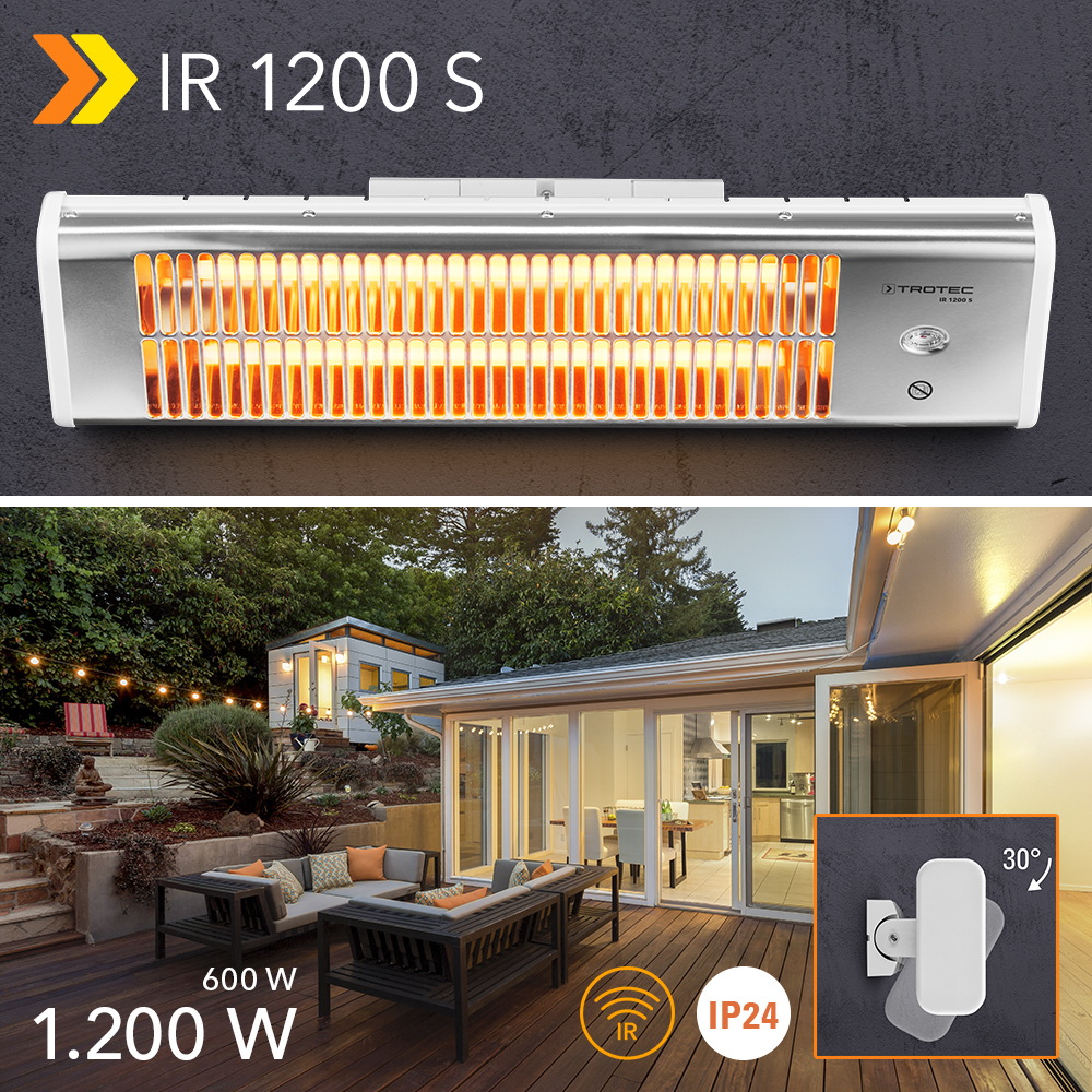 Kevät alkaa maaliskuussa, mutta lämpötilat ei välttämättä ole keväisiä. Ilma voi olla kylmää tai jäähtyä, jolloin pitkäaikainen oleskele terassilla tai parvekkeella ei houkuttele. Taikasana on ’lämpö’ – ja sitä tuottaa infrapunalämmitin IR 1200 S, jonka toimintaperiaate jäljittelee aurinkoa. Monikäyttöisen lämmittimen kaksi modernia kvartsilämpösäteilijää tuottavat nimittäin jopa 1200 W suoraa infrapunalämpö. Ympäristö lämpenee mukavasti heti alusta pitäen, ja suuri osa käytettävästä energiasta muuttuu suoraksi lämmöksi. Tämä on erityisen energiatehokasta!