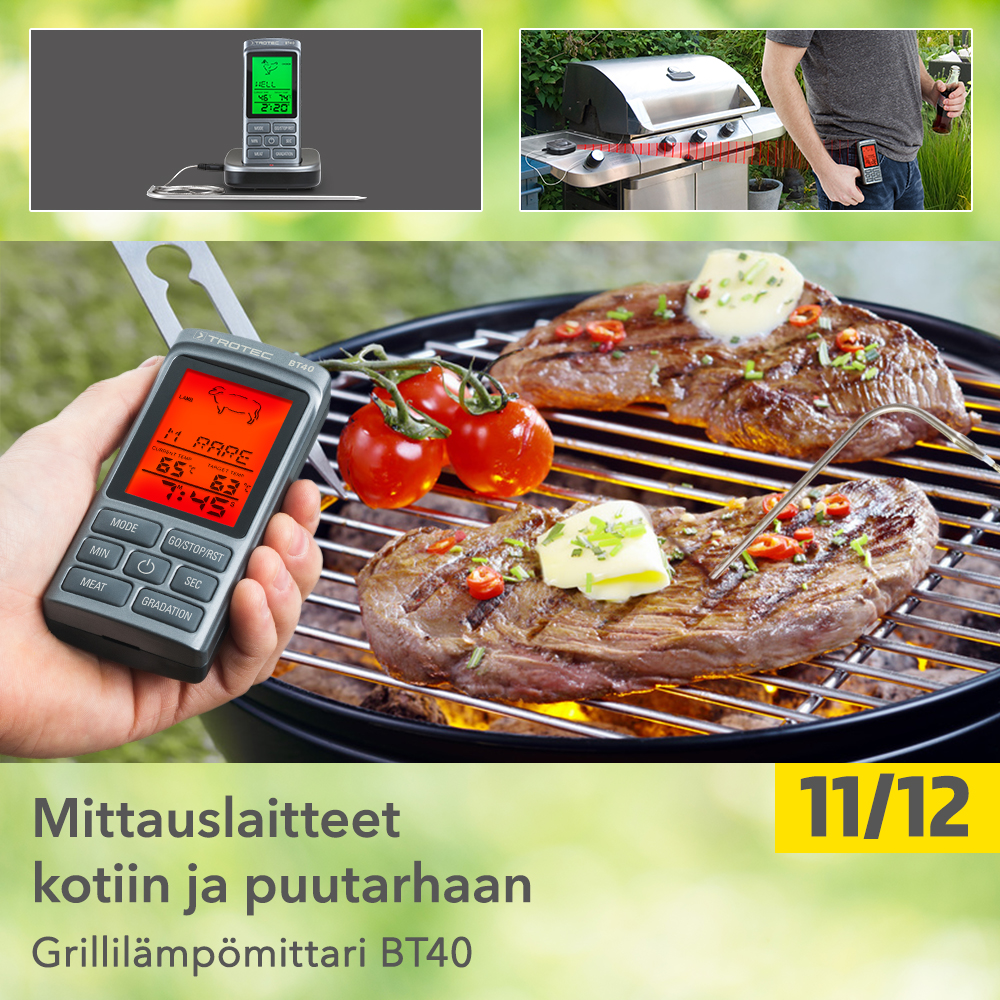 Etkö sinäkin kaipaa pientä vahvistusta ennen kuin ajankohtainen kevätsarjamme ylittää maaliviivan? Sytytetäänpä sitten grilli, laitetaan ruoat ritilälle – ja istutaan keskustelemaan vieraidemme kanssa! Sillä johdottoman BT40-grillilämpömittarin avulla sinun ei enää tarvitse itse seurata kypsennysprosessia grillatessasi ja paistaessasi. Laite ilmoittaa sinulle säännöllisesti kypsennettävän ruoan lämpötilan jopa 20 metrin päähän kantamansa sisällä. Ja ilmoittaa halutun kypsennysasteen saavuttamisesta merkkiäänellä ja näytön värimuutoksella. 8 esivalittavaa lihalajia sisältävän integroidun kypsennysavustajan avulla!