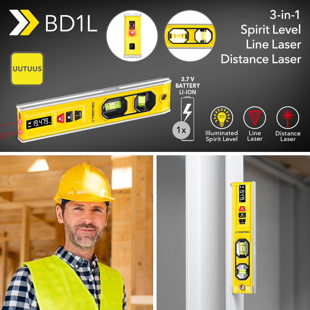Rajattoman käytännöllinen. Helppokäyttöinen. Superkätevä koko. Täydellinen pienyrittäjille, kotinikkareille, kalustajille ja sisustajille: Trotecin uusi akkukäyttöinen laservesivaaka BD1L on kolmen mittalaitteen yhdistelmä. Vesivaa’an valaistu vaaka-/pystysuora libelli tason mittaukseen Erikseen kytkettävä linjalaseri projisoi100 % vaakasuoran laserlinjan 10 metrin päähän. Laseretäisyysmittari mittaa millimetrin tarkkuudella etäisyydet 0,20 metristä 20 metriin. Voit porata reiät helposti täsmällisesti tasaisin välein, säätää kehykset varmasti vaakasuoraan ja mitata etäisyyksiä millimetrin tarkkuudella.