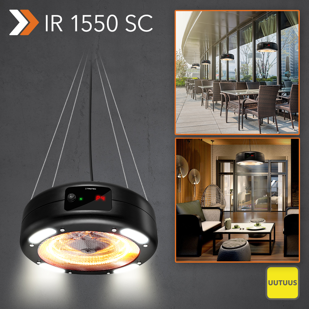 Koko maailma odottaa uusia UFO-havaintoja USA:sta, mutta me esittelemme jo uuden muotoiluratkaisun tulevaisuudesta. Innovatiivinen kattolämmitin IR 1550 SC tuo napin painalluksessa kesän tunnelman kokovuotisesti terassille tai parvekkeelle. Se riippuu elegantisti pään päällä, ja sen erikoinen muoto ja laadukas mattamusta pinta kiinnittävät varmasti huomion. Lujarakentein kattolämmitin on ihanteellinen lämmön lähde kaikkialla, kun kylmyyden sijasta halutaan mukavaa lämpöä. Luonnollisesti myös katetuissa istuma- ja seisomatiloissa, esimerkiksi ulkotarjoilutiloissa.