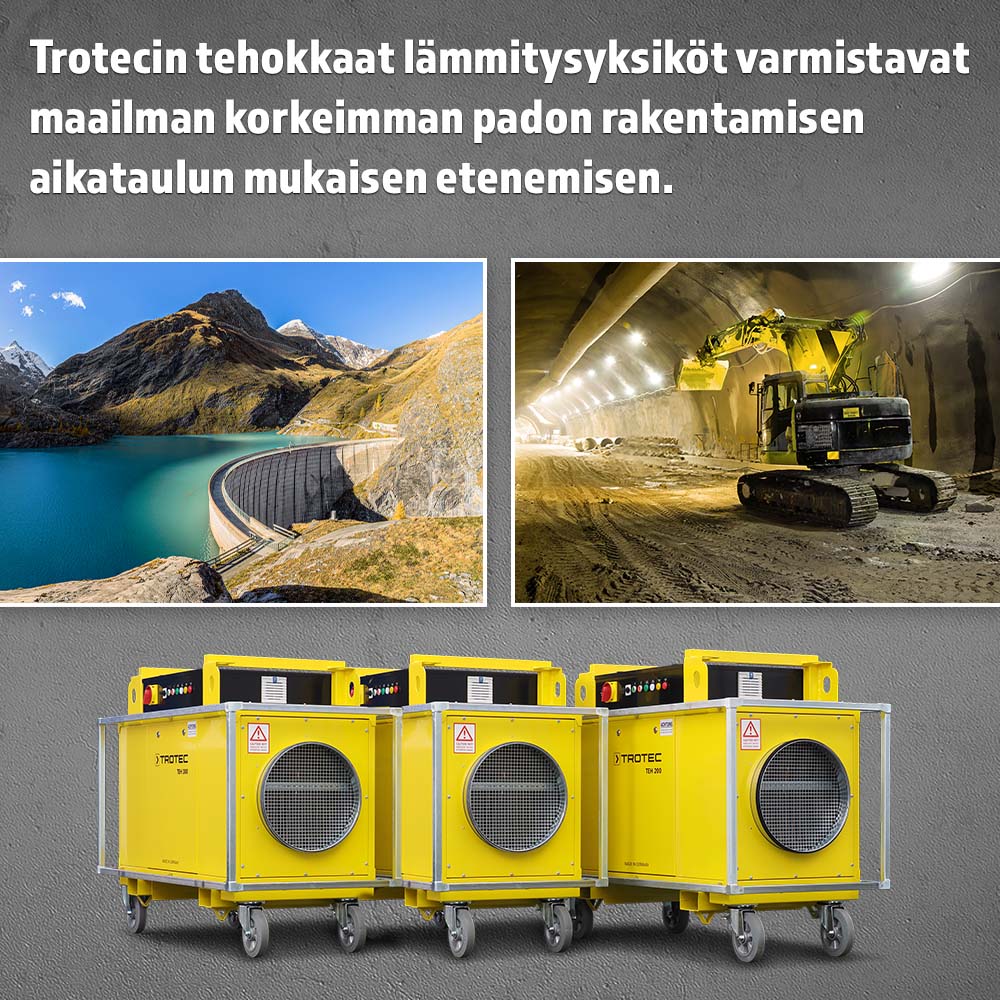 Uusimman TDE-sukupolven ammattikäyttöön tarkoitetut sähkölämmittimet ovat valmiina toimitettavaksi ennen kuin kaikki jäätyy työmaalla tai lämmittämissä varastoissa ja verstaissa. Lämmittimet tunnistaa sivupeltien logokuvioista. Tunnetusti luotettavan 100 % Trotec-merkkilaatuisen TDE 65:n teho on 12 kW, TDE 9:n jopa mahtavat 18 kW. Jatkuvaan häiriöttömään käyttöön suunnitellut sähkölämmittimet tuottavat tunti tunnilta yli 1 000 kuutiometriä puhdasta lämmintä ilmaa, joka voidaan tarvittaessa lämmittimeen liitettävällä letkulla etäisiin kohteisiin.
