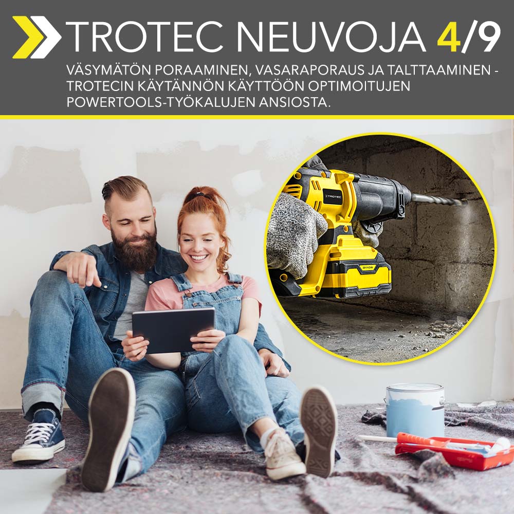 Kun teet pienen tai suuren remontin, olemme vahvana tukenasi. Tuemme projektejasi kaikin voimin monilla hyvillä vihjeillä ja osaamisella, ennen kaikkia kuitenkin Trotecin merkkilaatuisilla, käytännön tarpeisiin optimoiduilla PowerTooleilla. Haluamme heti aluksi huomauttaa remontoitaessa vapautuvien allergisoivien aineiden aliarvioiduista vaarasta. Vihjeillämme suojaudut epätoivotuilta seurauksilta – ja remontti onnistuu heti alusta.