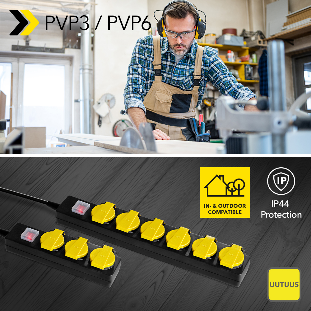 Kestävien PVP3- ja PVP6-jatkopistorasioiden tunnettu Trotec-laatu mahdollistavat sähkön turvallisen käytön myös ulkona – kostealla työmaalla, maatilalla tai sateen kastelemassa kotipuutarhassa. Voit kolmin- tai kuusinkertaistaa liitettävien sähkölaitteiden määrän, joiden teho on enintään 3,5 kW. Itsestään sulkeutuvat suojakannet estävät roiskeveden ja hiukkasten tunkeutumisen pistorasioihin, joiden kotelointiluokka on IP44. Ja mikä parasta: Keskelle sijoitetulla katkaisijalla voit kytkeä tai katkaista kaikkien pistorasioiden virran samanaikaisesti.