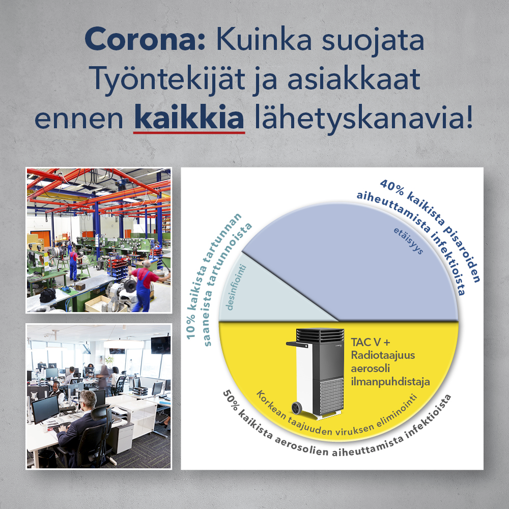 Aerosoleja ja pisaroita pidetään pintojen lisäksi yhtenä koronaviruksen pääleviämistavoista, vahvistavat tutkijat ja virologit. Jokainen puhuu desinfioinnista, turvaetäisyyksistä, maskipakosta tai suojaavista pleksilaseista. Mutta toistaiseksi julkisessa keskustelussa ei ole juurikaan puhuttu suojausratkaisuista kaiken pahinta tartuntavaaraa, nimittäin aerosolien välityksellä tapahtuvaa tartuntaa, vastaan. Joka toinen tartunta tapahtuu tällä tavoin. Trotec sulkee nyt tämän aukon turvallisuuskonsepteissa. Innovatiivisella suodatintekniikalla varustettu korkeataajuus-ilmanpuhdistin TAC V+ täydentää hygieniakonsepteja suojauksella ilmassa leviäviä aerosoleja vastaan.