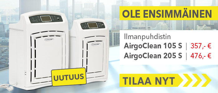 Uudet ilmanpuhdistimet huolehtivat puhtaasta ja raikkaasta hengitysilmasta. AirgoClean 105 S sopii tiloihin, joiden koko on 30 m², AirgoClean 205 S jopa 70 m²:n tiloihin saakka. Molemmat laitteet vähentävät hajuja ja likaisuuksia parantaen näin tuntuvasti ilmanlaatua. Huonepölyn, siitepölyn, herkistävien aineiden, eläinkarvojen sekä huonekaluista lähtevien hajujen ja tapettien höyrystyminen vaikuttavat nimittäin terveyteemme ja viihtyvyyteemme. Tiesitkö esimerkiksi, että kuutiometrissä ilmaa voi olla jopa 15.000 flunssavirusta? AirgoClean-laitteet poistavat ne vain napin painalluksella! Lue loppuun