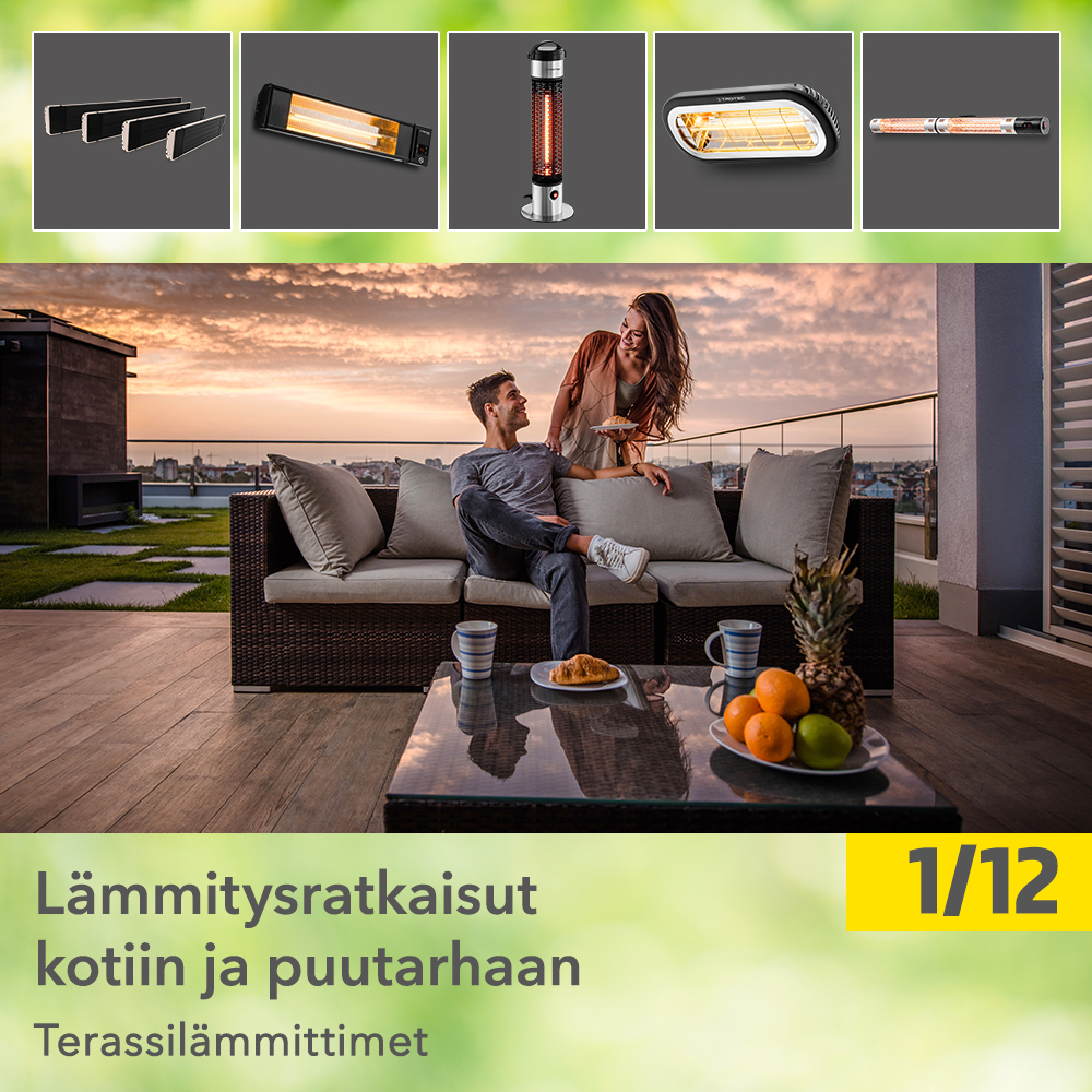 Kevät on ovella. Paras aika katsoa, onko kaikki kunnossa talossa ja puutarhassa – ja korjata, parantaa tai siistiä yhtä sun toista samalla. Meiltä saat lähes kaikki tähän tarvittavat käytännön sähkötyökalut. Uusi sarjamme tarjoaa sinulle yleiskatsauksen Trotecin tehokkaisiin verkkovirta- ja akkukäyttöisiin sähkötyökaluihin – kaikki ammattilaatuisia työkaluja tee-se-itse-hintaan. Tehokkaat pumput puutarhan kasteluun ja tarkat mittalaitteet uima-altaan ja grillausvälineiden tarkistamiseen täydentävät kevätvalikoimamme. Heti alkuun haluamme kuitenkin inspiroida sinua lämmitysratkaisuilla, joiden avulla voit nauttia terassistasi tai parvekkeestasi myös viileinä päivinä.