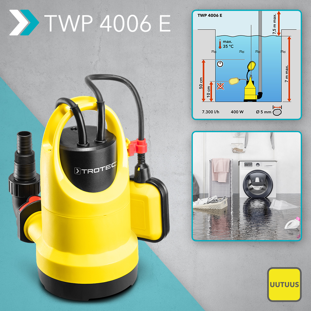 Uppopumpulla TWP 4006 E olet varustautunut mitä parhaiten kaikkiin kodin ja puutarhan sekä yrityksen kastelu- ja kuivaustehtäviin. Tehokkaasti vettä siirtävä yleiskäyttöinen kirkasvesi-uppopumppu on joustava apuväline, joka sopii hieman likaantuneen veden siirtämiseen ja poispumppaukseen uima-altaiden ja lampien, kaivojen, sadevesitynnyrien, maanalaisten säiliöiden tai sadevesisäiliöiden yhteydessä. Lisäksi pintaa myöten imevillä uppopainepumpuilla on mahdollista tyhjentää kaatosateen, pesukonevuotojen tai pohjaveden täyttämät kellari- ja pesutilat niin, että jälki on kuin kuivaksi pyyhittyä.