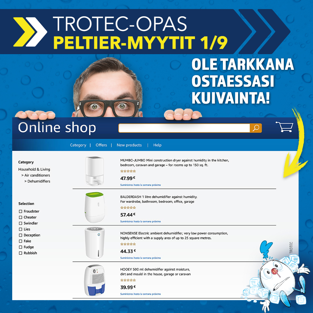 Tulvia, täyttyneitä kellareita, vettä autotallissa: Rajuilmakatastrofi on aiheuttanut pahoja myrsky- ja vesivahinkoja suuressa osassa Eurooppaa. Rajuilman jälkeen on vahinkojen korjaamisen vuoro. Uppopumput, lämmittimet ja erityisesti ilmankuivaimet viedään käsistä rautakaupoissa ja verkkomyynnissä. Tehokkaan kompressoritekniikan sisältävien ilmankuivainten suuri kysyntä on tuonut ”vanavedessään” myös lukuisia petollisia tarjouksia. Hätä keinot keksii! Jos homeen torjuntaan sopiva kuivain puuttuu valikoimasta, tilalle tarjotaan sopimattomia laitteita ihmeaseeksi suurta ilmankosteutta vastaan.
