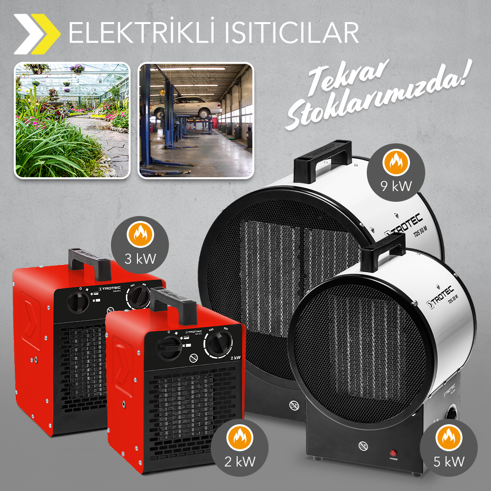 Soğuk havalara rağmen garajlarda araba tamiri veya bodrum katında çalışmalar, elektrikli ısıtıcılar ile çok kolay. Üstünüzü kalın giyinmeniz bazı durumlarda yeterli olmaz ve bunun için Trotec ideal ısıtma çözümü sunuyor: TDS serisi elektrikli ısıtıcılar.