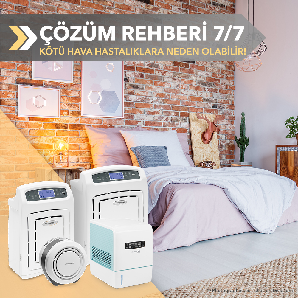 Fakat iç mekan iklimi tamamen sizin elinizde! Zamanımızın %90’lık bölümünü kapalı alanlarda geçirdiğimize göre, iç mekan iklimi öncelikli konulardan biri olmalıdır. Birçok araştırma doğru iklimin insan sağlığı, üretkenliği, ruh hali ve çocukların öğrenme yetenekleri üzerinde olumlu etkiler oluşturduğunu göstermektedir. Trotec nem alıclar, nemlendiriciler veya hava arıtıcalar ile iç mekanlarınızda sağlıklı iklim oluşturup, keyifli yaşam alanlarına dönüştürebilirsiniz. Bu da bizim yeteneğimiz!