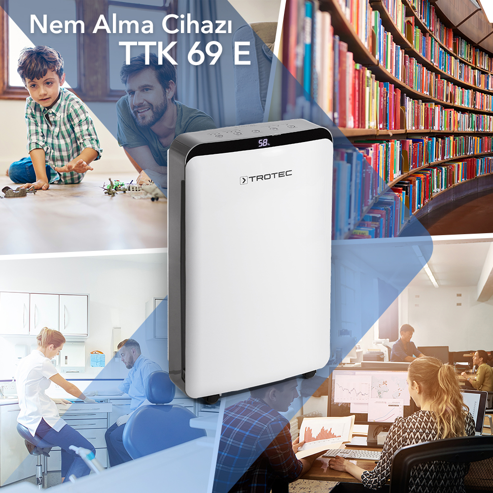 Şık tasarımı ile yaşam alanlarına uyum sağlayan konfor nem alma cihazı TTK 69 E. Özel donanımları ile ikna eder ve sahip olduğu fonksiyonları ile ideal sonuçlar sağlar.