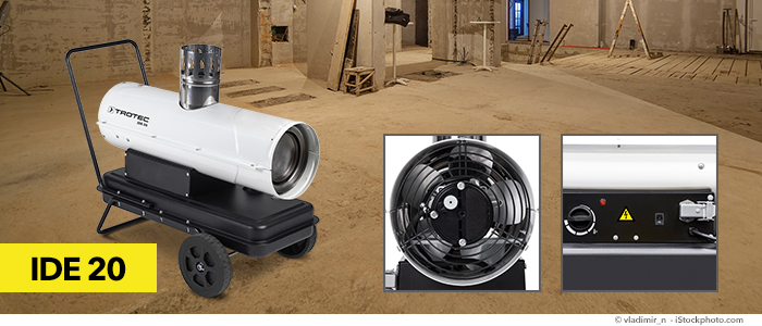 İkna ediyor: İnşaat alanları için sıcak hava! Bu mazotlu ısıtıcı tüm çalışmalarınızda sizin desteğiniz oluyor: mazotlu ısıtıcı IDE 20. İç ve dış alanlar için uygundur, çok kompakt ve çok uygun. Profesyoneller için güvenilir ısıtma çözümleri.
